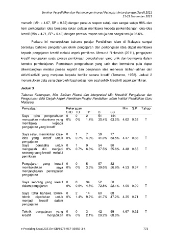kreatif (Min = 4.71, SP = 0.49) dengan peratus respon setuju dan sangat setuju 98.6%.