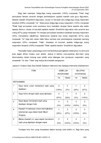 Jadual 4: Analisis Data Soal Selidik Sebelum Intervensi dan Selepas Intervensi (Kefahaman)