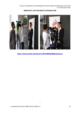 Seminar Penyelidikan dan Pertandingan Inovasi Peringkat Antarabangsa (Serai) 2021 21-22 September 2021 MENDAPAT LIPUTAN BERITA PERDANA RTM https://www.youtube.com/watch?v=fBY3kMUMZUM&authuser=0 \ e-Prosiding Serai 2021/e-ISBN 978-967-19359-3-4 76