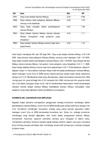 Hasil kajian mendapati Min dan SP bagi SM1. Saya suka belajar bahasa Melayu 3.34 0.94