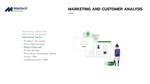 MARKETING AND CUSTOMER ANALYSIS • Marketing Objectives • Marketing Strategies • Marketing Tactics • Product Life Cycle • Price Optimization • Place (Channel) • Productivities • Promotion (Campaign Base) • Action Plan • Implementation CRM