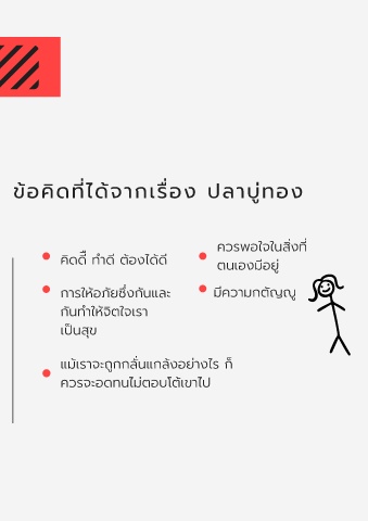 ู่ ้ ี ื ิ ขอคดท ไดจากเร อง ปลาบทอง ้ ิ ควรพอใจในส งท ี ื ี คดด ทําด ตองไดด ี ี ้ ้ ิ ี ตนเองมอย ู่ ั ี ั ึ ั ้ การใหอภยซ งกนและ มความกตญ ู ั กนทําใหจตใจเรา ิ ้ เปนสข ุ แมเราจะถกกล นแกลงอยางไร ก ็ ่ ้ ั ู ้ ้ ควรจะอดทนไมตอบโตเขาไป ่