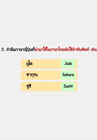 3. คํายืมภาษาญี่ปุ่นที่นํามาใช้ในภาษาไทยมักใช้คําทับศัพท์ เช่น ยูโด Judo ซากุระ Sakura ซูชิ Sushi