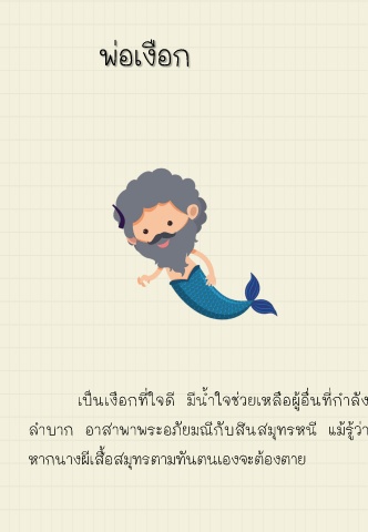 พ่อเงือก เป็นเงือกที่ใจดี มีน้ าใจช่วยเหลือผู้อื่นที่ก าลัง ล าบาก อาสาพาพระอภัยมณีกับสินสมุทรหนี แม้รู้ว่า หากนางผีเสื้อสมุทรตามทันตนเองจะต้องตาย