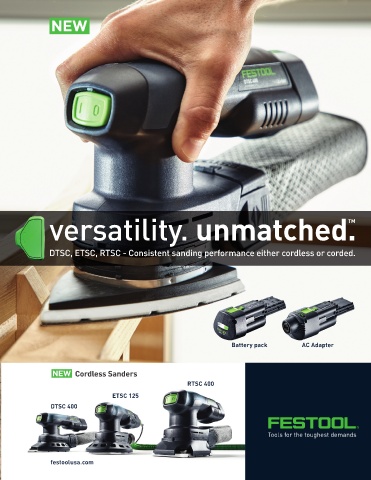 versatility. unmatched. TM DTSC, ETSC, RTSC - Consistent sanding performance either cordless or corded. Battery pack AC Adapter Cordless Sanders RTSC 400 ETSC 125 DTSC 400 festoolusa.com CABINET MAKERS ASSOCIATION 3