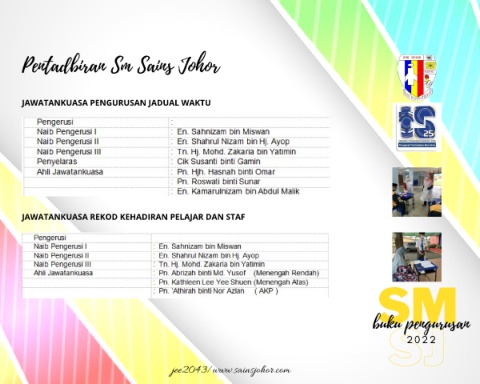 Pentadbiran Sm Sains Johor JAWATANKUASA PENGURUSAN JADUAL WAKTU JAWATANKUASA REKOD KEHADIRAN PELAJAR DAN STAF SM SJ buku pengurusan 2 2 0 2 jee2043/www.sainsjohor.com