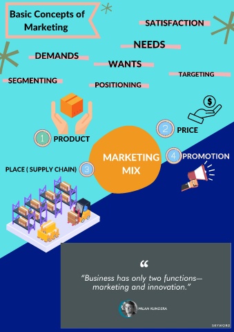 Basic Concepts of Marketing SATISFACTION NEEDS DEMANDS WANTS TARGETING SEGMENTING POSITIONING PRICE PRODUCT MARKETING PROMOTION PLACE ( SUPPLY CHAIN) MIX