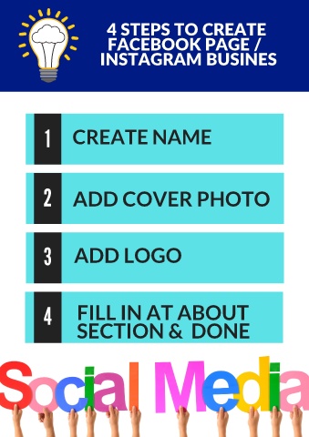 4 STEPS TO CREATE FACEBOOK PAGE / INSTAGRAM BUSINES 1 CREATE NAME 2 ADD COVER PHOTO 3 ADD LOGO 4 FILL IN AT ABOUT SECTION & DONE