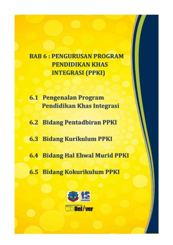 BAB 6 : PENGURUSAN PROGRAM PENDIDIKAN KHAS INTEGRASI (PPKI) 6.1 Pengenalan Program Pendidikan Khas Integrasi 6.2 Bidang Pentadbiran PPKI 6.3 Bidang Kurikulum PPKI 6.4 Bidang Hal Ehwal Murid PPKI 6.5 Bidang Kokurikulum PPKI