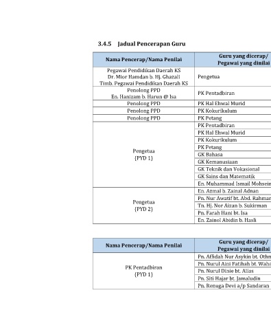 Jadual Pencerapan Guru Nama Pencerap/Nama Penilai Pegawai Pendidikan Daerah KS Dr. Mior Hamdan b. Hj. Ghazali Timb. Pegawai Pendidikan Daerah KS Penolong PPD En. Hanizam b. Harun @ Isa Penolong PPD Penolong PPD Penolong PPD Pengetua (PYD 1) Pengetua (PYD 2) Nama Pencerap/Nama Penilai PK Pentadbiran (PYD 1)