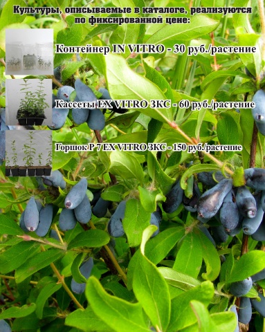 Культуры, описываемые в каталоге, реализуются по фиксированной цене: Контейнер IN VITRO - 30 руб./растение Кассеты EX VITRO ЗКС - 60 руб./растение Горшок Р 7 EX VITRO ЗКС - 150 руб./растение