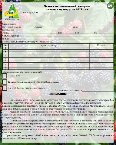 Бланк с заказом можно отправить письмом на адрес 393760, Тамбовская область, г. Мичуринск, ул. Совет-