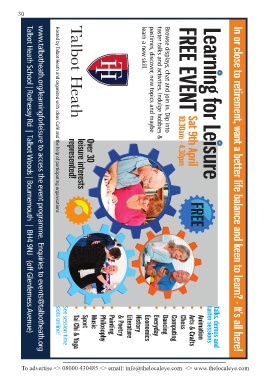 30 Talbot Heath School | Rothesay Rd | Talbot Woods | Bournemouth | BH4 9NJ www.talbotheath.org/learningforleisure to access the event programme. Enquiries to events@talbotheath.org Hosted by Talbot Heath and organised with Ideas Café and the help of participating organisations represented! leisure interests Over 30 lear