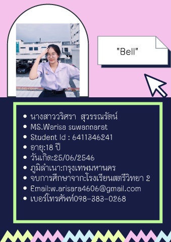 "Bell" ั ุ ิ นางสาววรศรา สวรรณรตน MS.Warisa suwannarat Student Id : 6411346241 ุ อาย:18 ป ิ วนเกด:25/06/2546 ั ิ ุ ภมลําเนา:กรงเทพมหานคร ู ิ ี ี ึ จบการศกษาจาก:โรงเรยนสตรวทยา 2 Email:w.arisara4606@gmail.com เบอรโทรศพท098-383-0268 ั