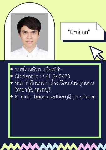 "Brai an" ็ ั ิ นายไบรอรท เอดเบรก Student Id : 6411345970 จบการศกษาจาก:โรงเรยนสวนกหลาบ ี ุ ึ ี ิ ั วทยาลย นนทบร ุ E-mail : brian.a.edberg@gmail.com