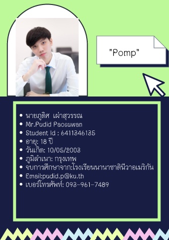 "Pomp" ุ ู ิ นายภดศ เผาสวรรณ Mr.Pudid Paosuwan Student Id : 6411346135 ุ อาย: 18 ป ิ ั วนเกด: 10/05/2003 ุ ิ ภมลําเนา: กรงเทพ ู ี ิ ั ิ ี ึ จบการศกษาจาก:โรงเรยนนานาชาตนวาอเมรกน Email:pudid.p@ku.th เบอรโทรศพท: 093-961-7489 ั