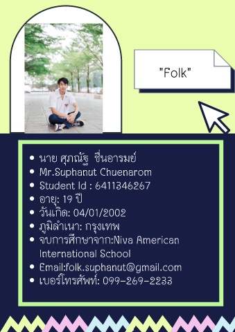 "Folk" ื่ ุ ั นาย ศภณฐ ชนอารมย Mr.Suphanut Chuenarom Student Id : 6411346267 อาย: 19 ป ุ ิ ั วนเกด: 04/01/2002 ุ ู ภมลําเนา: กรงเทพ ิ ึ จบการศกษาจาก:Niva American International School Email:folk.suphanut@gmail.com เบอรโทรศพท: 099-269-2233 ั