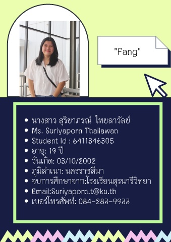 "Fang" ิ ุ นางสาว สรยาภรณ ไทยลาวลย ั Ms. Suriyaporn Thailawan Student Id : 6411346305 อาย: 19 ป ุ วนเกด: 03/10/2002 ิ ั ี ิ ู ภมลําเนา: นครราชสมา จบการศกษาจาก:โรงเรยนสรนารวทยา ี ุ ึ ี ิ Email:Suriyaporn.t@ku.th เบอรโทรศพท: 084-283-9933 ั