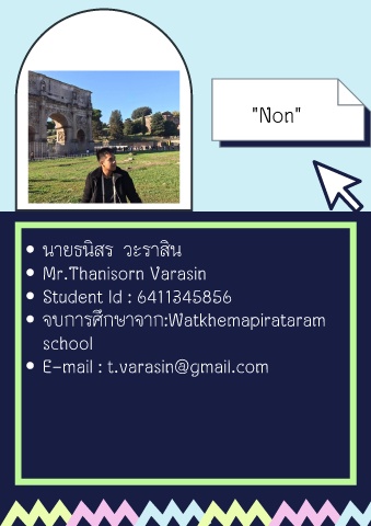 "Non" ิ ิ นายธนสร วะราสน Mr.Thanisorn Varasin Student Id : 6411345856 ึ จบการศกษาจาก:Watkhemapirataram school E-mail : t.varasin@gmail.com