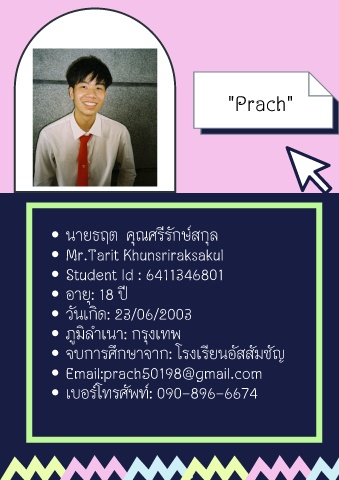 Prach "Prach" ุ ี ั ุ นายธฤต คณศรรกษสกล Mr.Tarit Khunsriraksakul Student Id : 6411346801 ุ อาย: 18 ป ิ ั วนเกด: 23/06/2003 ู ุ ิ ภมลําเนา: กรงเทพ จบการศกษาจาก: โรงเรยนอสสมชญ ี ึ ั ั ั Email:prach50198@gmail.com ั เบอรโทรศพท: 090-896-6674