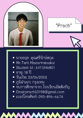 "PPrraacchh" นายธฤต คุณศรีรักษ์สกุล Mr.Tarit Khunsriraksakul Student Id : 6411346801 อายุ: 18 ปี วันเกิด: 23/06/2003 ภูมิลำเนา: กรุงเทพ จบการศึกษาจาก: โรงเรียนอัสสัมชัญ Email:prach50198@gmail.com เบอร์โทรศัพท์: 090-896-6674