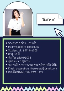 "Baifern" นางสาวปวีณ์กร เถรแก้ว Ms.Paweekorn Thenkaew Student Id : 6411346003 อายุ: 18 ปี วันเกิด: 23/01/2003 ภูมิลำเนา: ปทุมธานี จบการศึกษาจาก:สวนกุหลาบวิทยาลัย รังสิต Email: paweekorn.thenkaew@gmail.com เบอร์โทรศัพท์: 095-249-1419