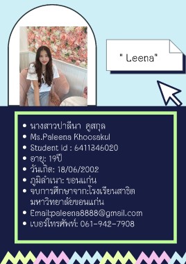 " Leena" นางสาวปาลีนา คูสกุล Ms.Paleena Khoosakul Student Id : 6411346020 อายุ: 19ปี วันเกิด: 18/06/2002 ภูมิลำเนา: ขอนแก่น จบการศึกษาจาก:โรงเรียนสาธิต มหาวิทยาลัยขอนแก่น Email:paleena8888@gmail.com เบอร์โทรศัพท์: 061-942-7908