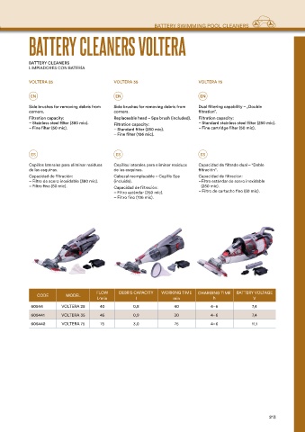 FLOW DEBRIS CAPACITY WORKING TIME CHARGING TIME BATTERY VOLTAGE