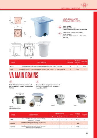 Body of the main drains is made of ABS El cuerpo de los desagües principales está