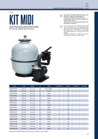 CODE FILTER VALVE Ø PUMP FLOW RATE SAND kg WEIGHT VOLUME