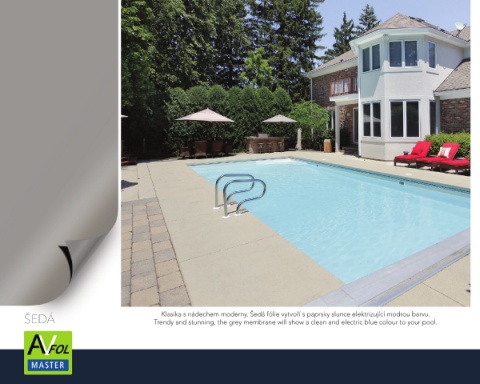 Klasika s nádechem moderny. Šedá fólie vytvoří s paprsky slunce elektrizující modrou barvu. ŠEDÁ Trendy and stunning, the grey membrane will show a clean and electric blue colour to your pool.