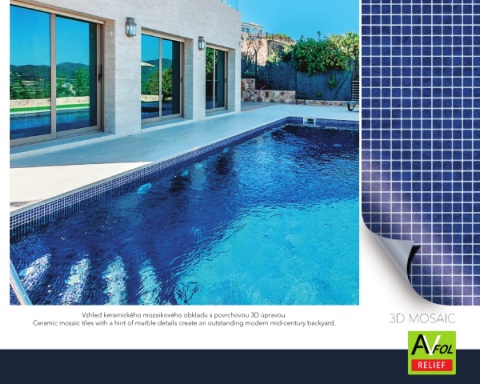 Vzhled keramického mozaikového obkladu s povrchovou 3D úpravou. Ceramic mosaic tiles with a hint of marble details create an outstanding modern mid-century backyard. 3D MOSAIC