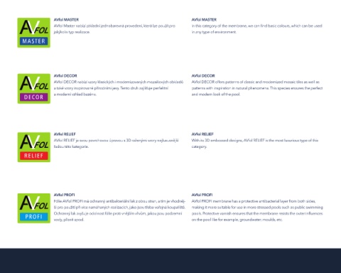 AVfol Master nabízí základní jednobarevná provedení, která lze použít pro In this category of the membrane, we can find basic colours, which can be used