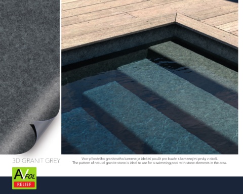 Vzor přírodního granitového kamene je ideální použít pro bazén s kamennými prvky v okolí. 3D GRANIT GREY The pattern of natural granite stone is ideal to use for a swimming pool with stone elements in the area.