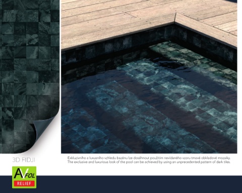 Exkluzivního a luxusního vzhledu bazénu lze dosáhnout použitím nevídaného vzoru tmavé obkladové mozaiky. 3D FIDJI The exclusive and luxurious look of the pool can be achieved by using an unprecedented pattern of dark tiles.