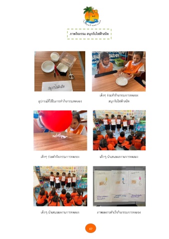 ภาพกิจกรรม สนุกกับไฟฟาสถิต ้ เด็กๆ ร่วมทำกิจกรรมการทดลอง อุปกรณที่ใช้ในการทำกิจกรรมทดลอง สนุกกับไฟฟ้าสถิต ์ เด็กๆ ร่วมทำกิจกรรมการทดลอง เด็กๆ นำเสนอผลงานการทดลอง เด็กๆ นำเสนอผลงานการทดลอง ภาพผลงานสำเร็จกิจกรรมการทดลอง 47