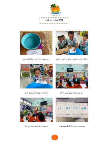 ภาพกิจกรรม กักน้ำไว้ได้ ์ อุปกรณที่ใช้ในการทำกิจกรรมทดลอง เด็กๆ ร่วมทำกิจกรรมการทดลอง กักน้ำไว้ได้ เด็กๆ ร่วมทำกิจกรรมการทดลอง เด็กๆ นำเสนอผลงานการทดลอง เด็กๆ นำเสนอผลงานการทดลอง ภาพผลงานสำเร็จกิจกรรมการทดลอง 5