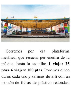 Corremos por esa plataforma metálica, que resuena por encima de la música, hasta la taquilla: 1 viaje: 25 ptas. 6 viajes: 100 ptas. Ponemos cinco duros cada uno y salimos de allí con un montón de fichas de plástico redondas.