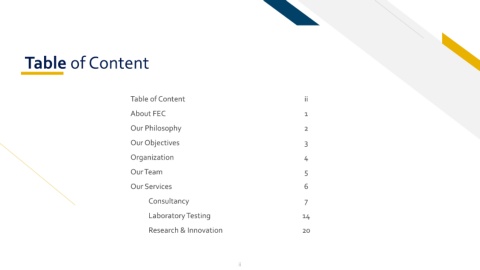 Table of Content Table of Content ii About FEC 1 Our Philosophy 2 Our Objectives 3 Organization 4 Our Team 5 Our Services 6 Consultancy 7 Laboratory Testing 14 Research & Innovation 20 ii