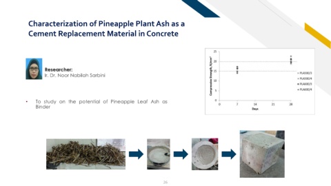 Characterization of Pineapple Plant Ash as a Cement Replacement Material in Concrete Researcher: Ir. Dr. Noor Nabilah Sarbini • To study on the potential of Pineapple Leaf Ash as Binder 26