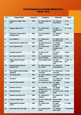 Bil. Program/Majlis Pengerusi Penyelaras Setiausaha Tarikh