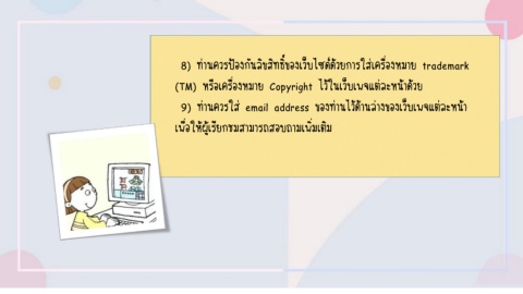 8) ท่านควรป้องกันลิขสิทธิ์ของเว็บไซด์ด้วยการใส่เครื่องหมาย trademark (TM) หรือเครื่องหมาย Copyright ไว้ในเว็บเพจแต่ละหน้าด้วย 9) ท่านควรใส่ email address ของท่านไว้ด้านล่างของเว็บเพจแต่ละหน้า เพื่อให้ผู้เรียกชมสามารถสอบถามเพิ่มเติม