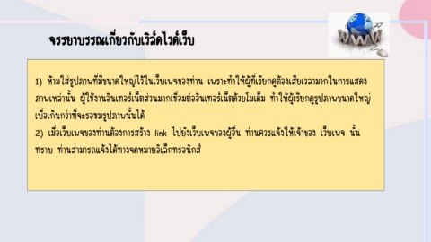 1) ห้ามใส่รูปภาพที่มีขนาดใหญ่ไว้ในเว็บเพจของท่าน เพราะท าให้ผู้ที่เรียกดูต้องเสียเวลามากในการแสดง