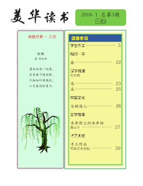 美华读书 2018- 1 总第3期 目录 诗歌月赏 - 三月 汉语学习 学生作文 ………………… 5 咏柳 每日一字 唐 贺知章 春……………………… 22 碧玉妆成一树高, 汉字微课 万条垂下绿丝绦。 刘永利 不知细叶谁裁出, 二月春风似剪刀。 笔……………………… 23 采……………………… 25 中国文化 女娲造人……………… 26 文学故事 水井街上的水井坊 桑宜川 ………………… 27 才艺天地 手工作品 明珠艺术学校 …………… 29