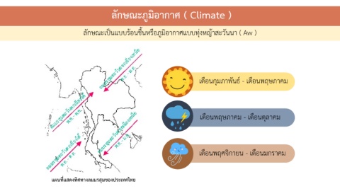 ลักษณะภูมิอากาศ ( Climate ) ลักษณะเป็นแบบร้อนชื นหรือภูมิอากาศแบบทุ่งหญ้าสะวันนา ( Aw ) เดือนกุมภาพันธ์ - เดือนพฤษภาคม เดือนพฤษภาคม - เดือนตุลาคม เดือนพฤศจิกายน - เดือนมกราคม แผนที่แสดงทิศทางลมมรสุมของประเทศไทย