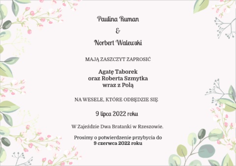 Paulina Ruman & Norbert Walewski MAJĄ ZASZCZYT ZAPROSIĆ Agatę Taborek oraz Roberta Szmytka wraz z Polą NA WESELE, KTÓRE ODBĘDZIE SIĘ 9 lipca 2022 roku W Zajeździe Dwa Bratanki w Rzeszowie. Prosimy o potwierdzenie przybycia do 9 czerwca 2022 roku
