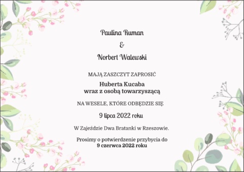 Paulina Ruman & Norbert Walewski MAJĄ ZASZCZYT ZAPROSIĆ Huberta Kucaba wraz z osobą towarzyszącą NA WESELE, KTÓRE ODBĘDZIE SIĘ 9 lipca 2022 roku W Zajeździe Dwa Bratanki w Rzeszowie. Prosimy o potwierdzenie przybycia do 9 czerwca 2022 roku