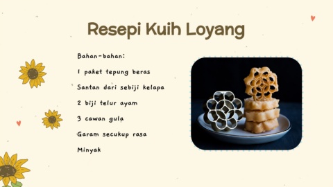 Resepi Kuih Loyang Bahan-bahan: 1 paket tepung beras Santan dari sebiji kelapa 2 biji telur ayam 3 cawan gula Garam secukup rasa Minyak