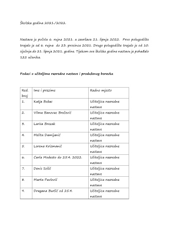 Nastava je počela 6. rujna 2021. a završava 21. lipnja 2022. Prvo polugodište