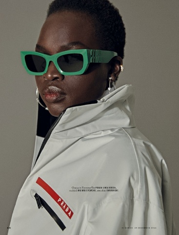 Giacca in Extreme-Tex PRADA LINEA ROSSA , occhiali MIU MIU EYEWEAR , orecchini SWAROVSKI . 6 6 I O D O N N A 2 4 D I C E M B R E 2 0 2 2